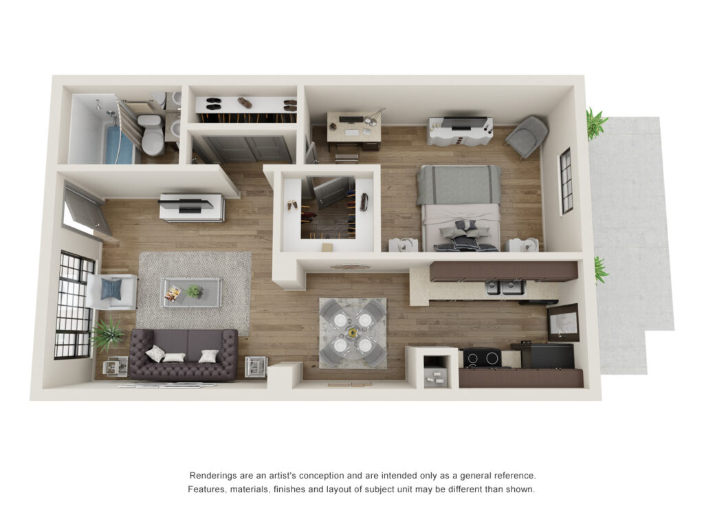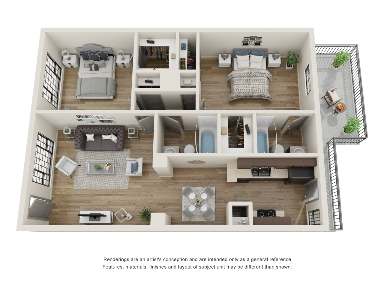Solo flyers, work-from-home warriors, or anyone who loves a good closet flex – The Picasso is a 1-bedroom, 1-bath slice of modern bungalow bliss with 886 square feet of style and smart design. This layout flows so well, you might catch yourself strutting from the front door to the kitchen like it’s a runway. Cozy living room? Check. Dining space for actual adulting? You bet. Some versions even come with a balcony big enough to pretend you’re in a vacation ad. There’s also a built-in granite desk area for when you need to “work from home” (aka scroll in style), plus a walk-in closet that might just deserve its own zip code.